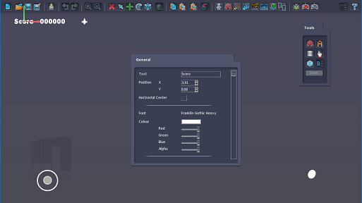 The HUD editor is used for modifying the game’s Head’s Up Display (HUD). The HUD in a Shoot ‘Em Up typically shows the player’s score and number of lives. It can also include the current weapon choice; ammunition level; coins collected; shield strength and much more.