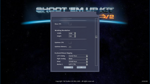 The Working Resolution is the resolution you will work at when designing your HUD, User Interface and 2D Sprite only games. You don’t have to run the Shoot ‘Em Up Kit at this resolution, it is just a reference width and height so that the Shoot ‘Em Up Kit knows what to do if your game is run on a PC with a different resolution.