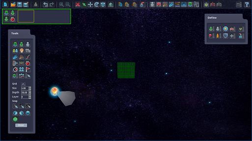 The Define menu allows you to set up definitions (or Templates) for the Players, NPCs, Weapons, Bullets, Shields, Upgrades, Player Input, and Movement characteristics. They contain a set of definitions that are ready to use but you can customise these for your game.