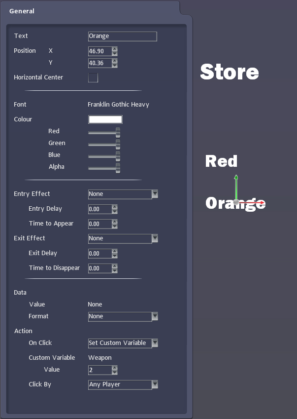Set the On Click action to change the Custom variable, in this case to 1 for the red weapon and 2 for orange:
